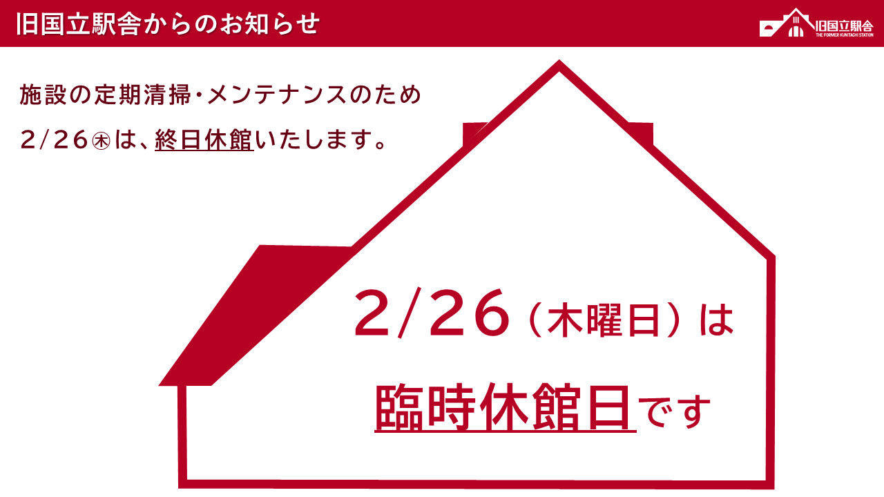 旧国立駅舎は施設の定期清掃・メンテナンスのため2026年2月26日(木曜日)は、終日休館いたします。