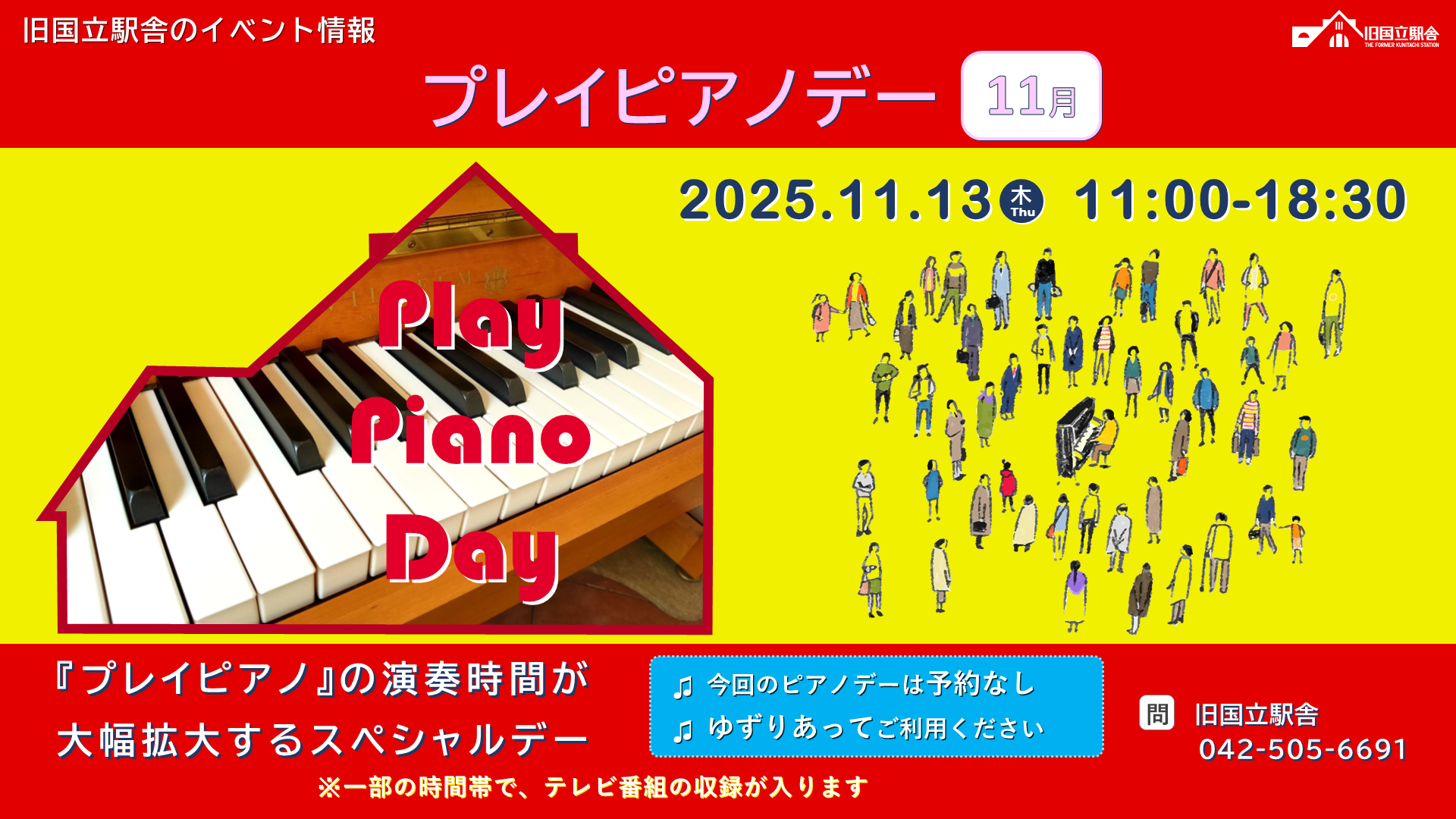 "まちの魅力発信拠点” 旧国立駅舎では、毎日行っている「プレイピアノ」の演奏時間を大幅拡大するスぺシャルデー『プレイピアノデー』を月に1回の頻度で開催しています。