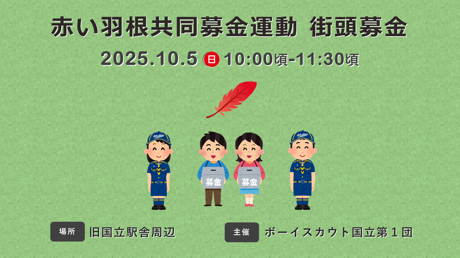赤い羽根共同募金運動 募金活動 (ボーイスカウト) 更新日:2025年09月24日 日程 2025年10月5日(日曜日) 10:00頃から11:30頃まで 場所 旧国立駅舎周辺 主催 ボーイスカウト国立第1団
