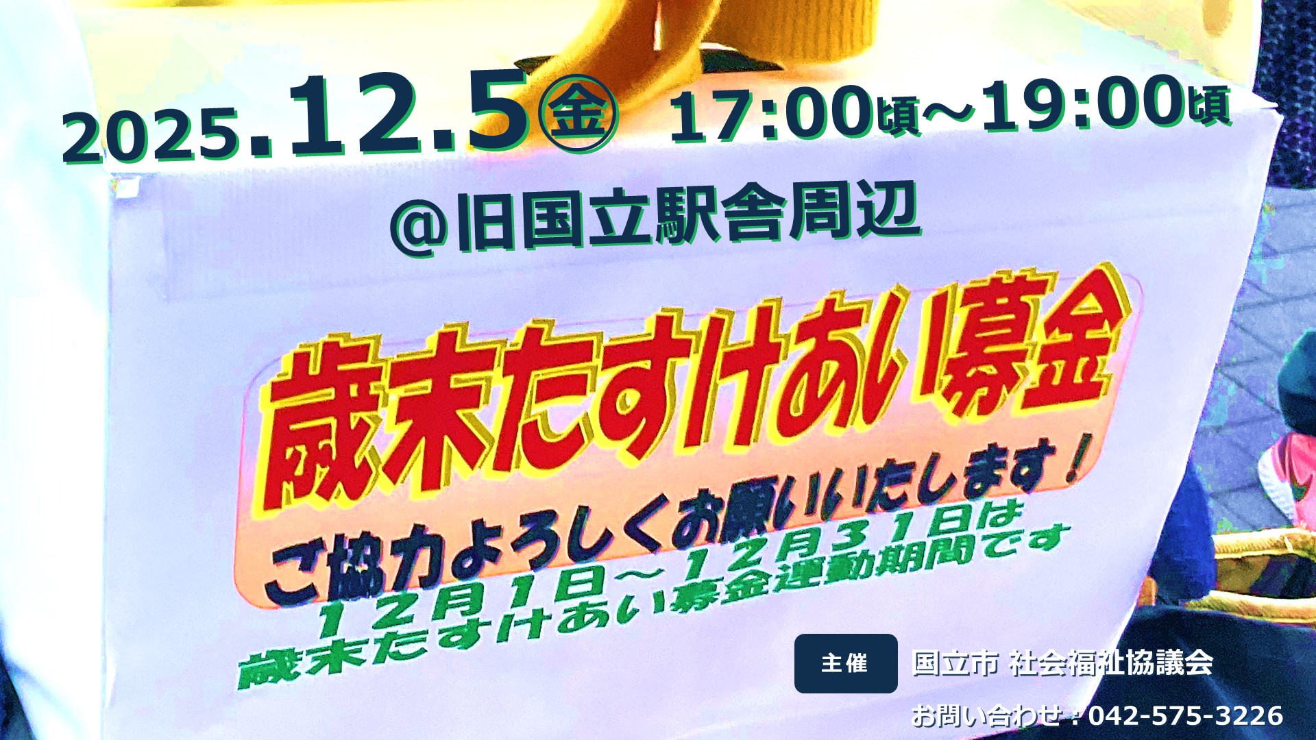 歳末たすけあい募金 (2025) 更新日:2025年11月20日 日程 2025年12月5日(金曜日) 17:00頃 - 19:00頃 場所 旧国立駅舎 屋外 主催 国立市社会福祉協議会 お問い合わせ: 電話 042-575-3226