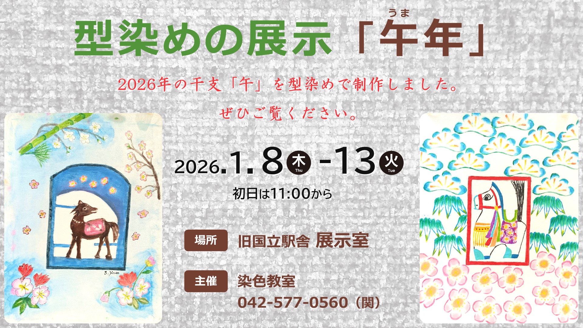 型染めの展示「午年」 更新日:2025年12月04日 2026年の干支「午」を型染めで制作しました。 ぜひご覧ください。 日程 2026年1月8日(木曜日)から 13日(火曜日)まで 初日は11:00頃から 場所 旧国立駅舎 展示室 主催 染色教室 お問い合わせ: 042-577-0560 (関)