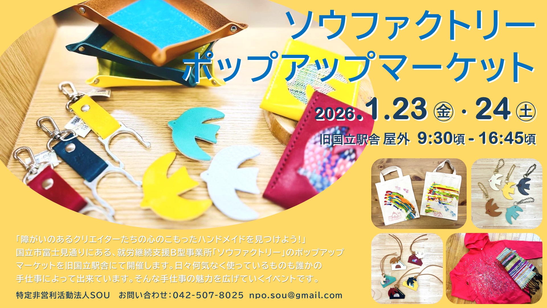 国立市富士見通りにある、就労継続支援B型事業所「ソウファクトリー」のポップアップマーケットを旧国立駅舎にて開催します。