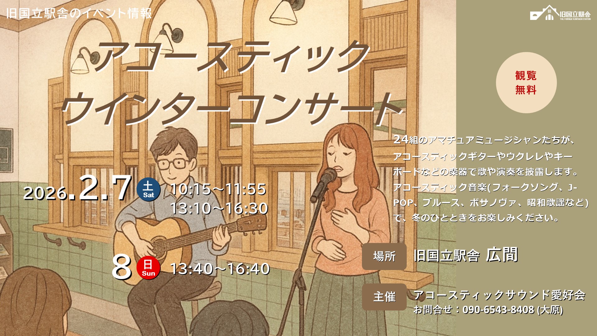 24組のアマチュアミュージシャンたちが、アコースティックギターやウクレレやキーボードなどの楽器で歌や演奏を披露します。アコースティック音楽(フォークソング、J-POP、ブルース、ボサノヴァ、昭和歌謡など)で、冬のひとときをお楽しみください。