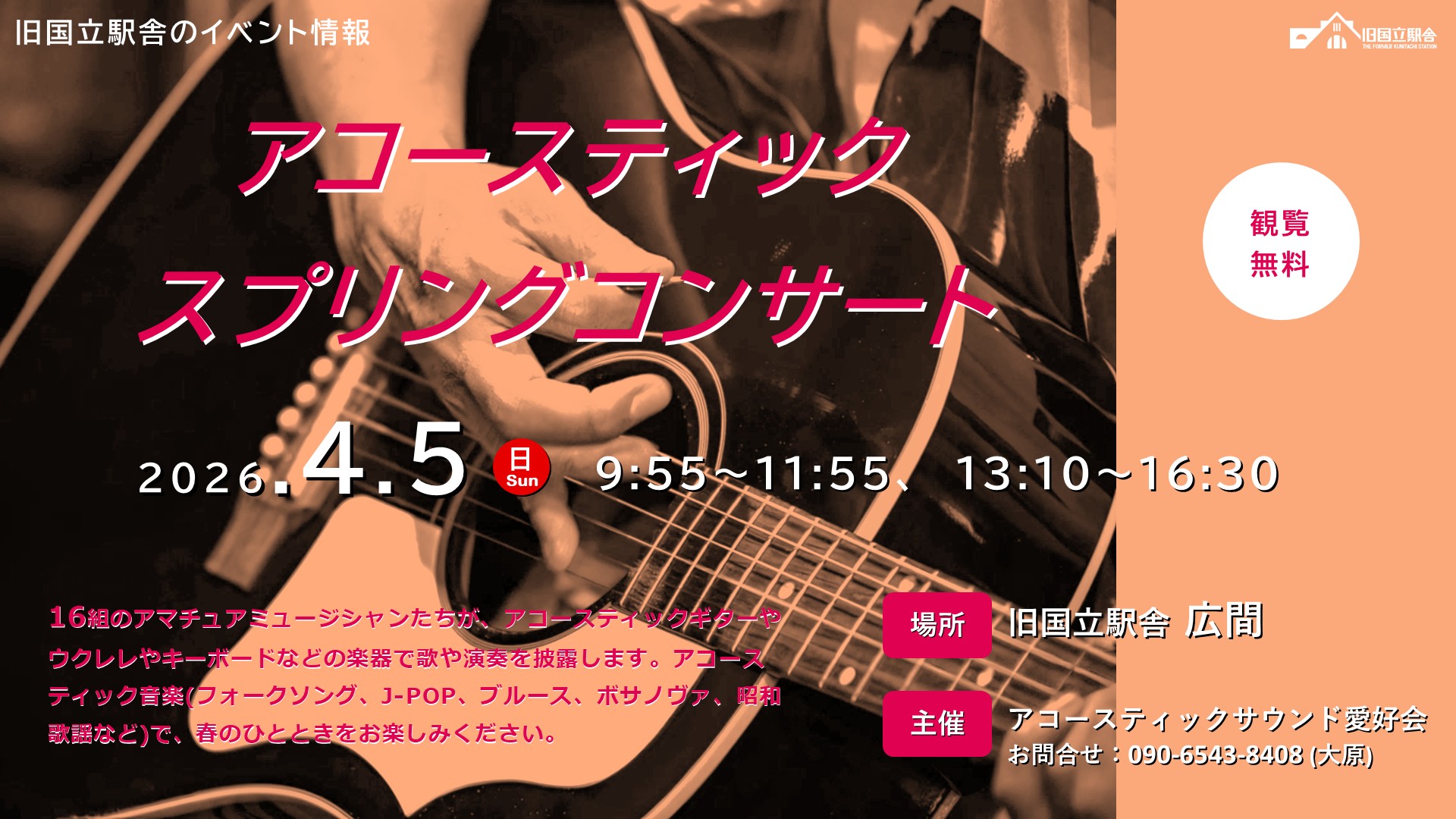 16組のアマチュアミュージシャンたちが、アコースティックギターやウクレレやキーボードなどの楽器で歌や演奏を披露します。アコースティック音楽(フォークソング、J-POP、ブルース、ボサノヴァ、昭和歌謡など)で、春のひとときをお楽しみください。