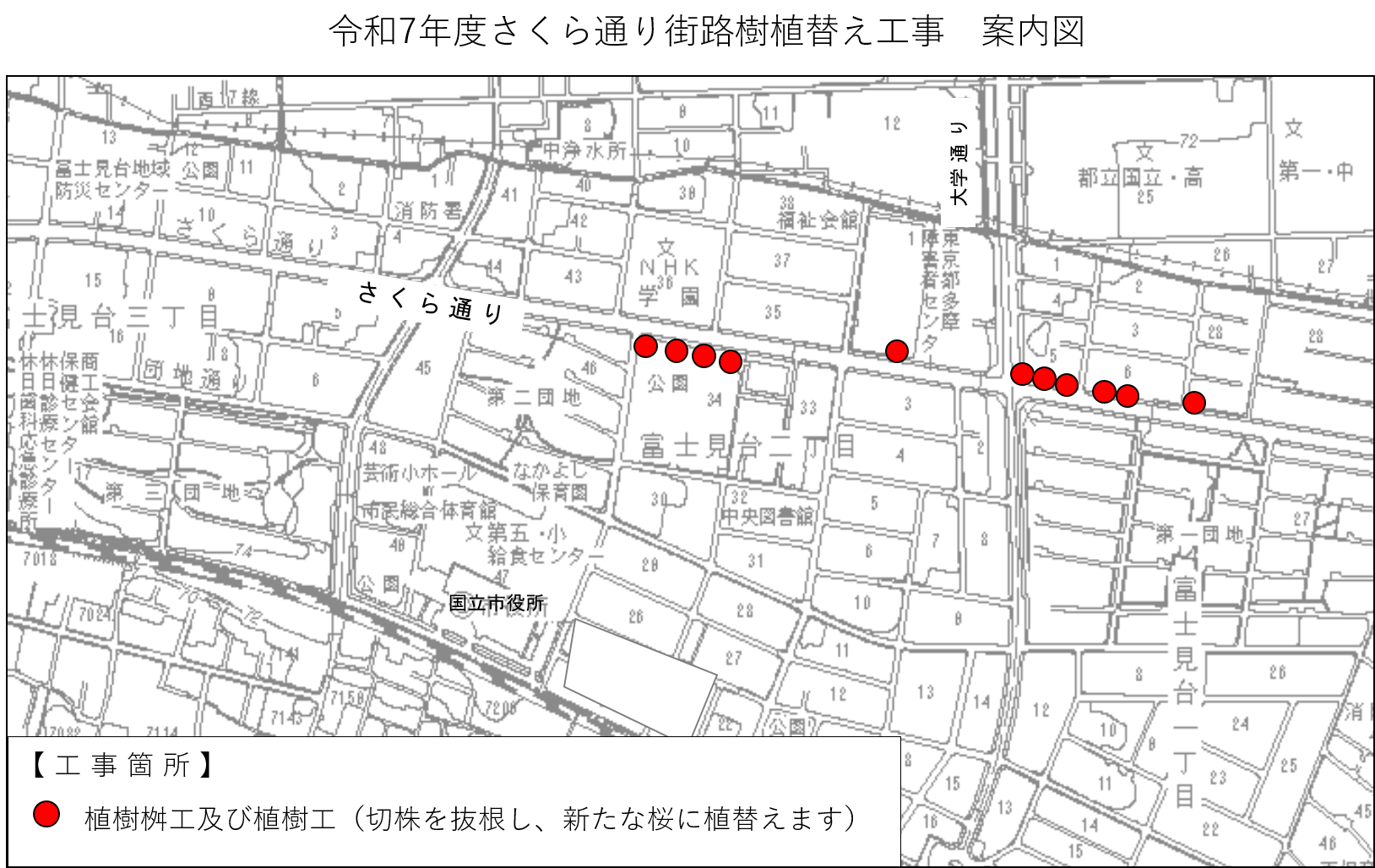 さくら通りでは、街路樹である桜の老木化が進行しており、道路改修事業が完了した後も、継続して樹木医による街路樹診断を行っています。診断の結果、倒木の危険性があると診断された桜は、安全確保のため伐採を行ってきましたが、令和5年度より、良好な沿道景観を形成すること等を目的として、毎年10箇所程度の伐採後の切株を新たな桜(ジンダイアケボノ)に植え替える工事を行っています。なお、令和7年度は、下図の箇所で植え替え工事を行う予定です。