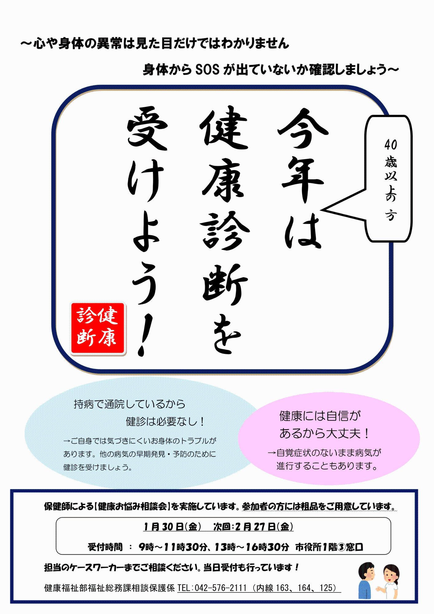 福祉総務課では毎月、保健師による健康相談をお受けしたり、血圧測定等を実施しています。事前予約または当日受付も行っています。詳しくは担当のケースワーカーにご相談ください。