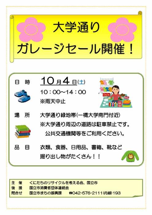 【中止のご案内】10月4日のガレージセールは中止となりました。