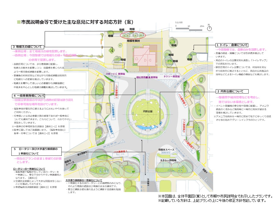 国立駅南口駅前広場基本設計(案)について、これまでの市民説明会や市民アンケート等で皆さまからいただいた主なご意見への対応方針(案)をまとめ報告しました。